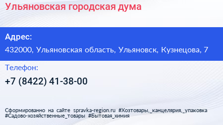 Ульяновская городская дума по адресу 432000, Ульяновская область, Ульяновск, Кузнецова, 7 в дальнейшем Организация, размещена в следующих категориях: