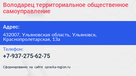 Володарец, территориальное общественное самоуправление по адресу 432007, Ульяновская область, Ульяновск, Краснопролетарская, 13а в дальнейшем Организация, размещена в следующих категориях: