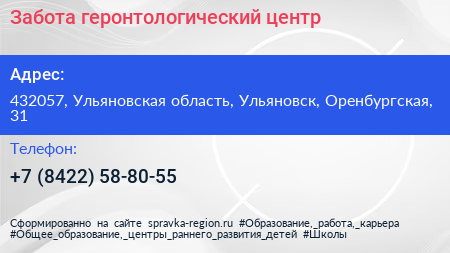 Забота, геронтологический центр по адресу 432057, Ульяновская область, Ульяновск, Оренбургская, 31 в дальнейшем Организация, размещена в следующих категориях: