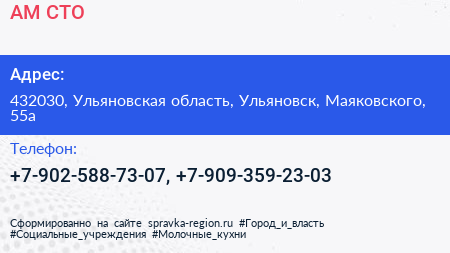 АМ, СТО по адресу 432030, Ульяновская область, Ульяновск, Маяковского, 55а в дальнейшем Организация, размещена в следующих категориях: