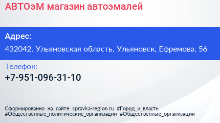 АВТОэМ, магазин автоэмалей по адресу 432042, Ульяновская область, Ульяновск, Ефремова, 56 в дальнейшем Организация, размещена в следующих категориях: