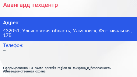 Авангард, техцентр по адресу 432051, Ульяновская область, Ульяновск, Фестивальная, 17Б в дальнейшем Организация, размещена в следующих категориях: