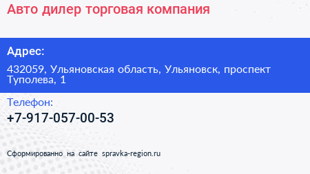 Авто-дилер, торговая компания по адресу 432059, Ульяновская область, Ульяновск, проспект Туполева, 1 в дальнейшем Организация, размещена в следующих категориях:
