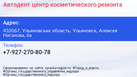 Автодент, центр косметического ремонта по адресу 432067, Ульяновская область, Ульяновск, Алексея Наганова, 6а в дальнейшем Организация, размещена в следующих категориях: