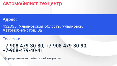 Автомобилист, техцентр по адресу 432035, Ульяновская область, Ульяновск, Автомобилистов, 8а в дальнейшем Организация, размещена в следующих категориях: