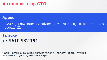 Автонавигатор, СТО по адресу 432072, Ульяновская область, Ульяновск, Инженерный 8-й проезд, 21 в дальнейшем Организация, размещена в следующих категориях: