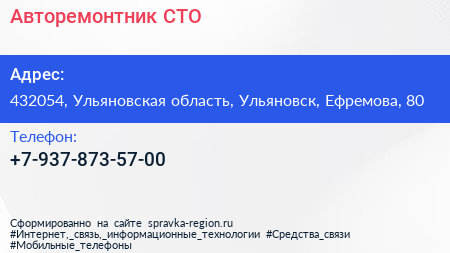 Авторемонтник, СТО по адресу 432054, Ульяновская область, Ульяновск, Ефремова, 80 в дальнейшем Организация, размещена в следующих категориях: