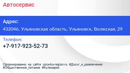 Автосервис по адресу 432046, Ульяновская область, Ульяновск, Волжская, 29 в дальнейшем Организация, размещена в следующих категориях:
