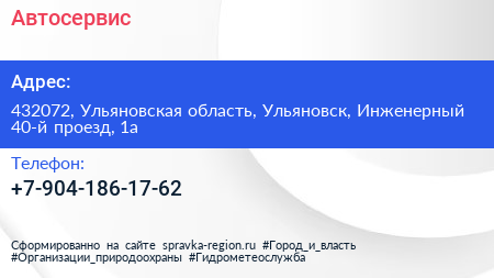 Автосервис по адресу 432072, Ульяновская область, Ульяновск, Инженерный 40-й проезд, 1а в дальнейшем Организация, размещена в следующих категориях: