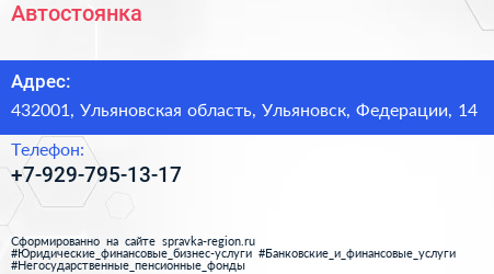 Автостоянка по адресу 432001, Ульяновская область, Ульяновск, Федерации, 14 в дальнейшем Организация, размещена в следующих категориях: