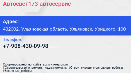 Автосвет173, автосервис по адресу 432002, Ульяновская область, Ульяновск, Урицкого, 100 в дальнейшем Организация, размещена в следующих категориях: