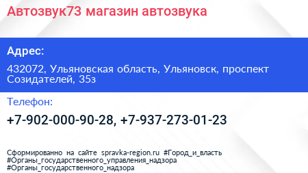 Автозвук73, магазин автозвука по адресу 432072, Ульяновская область, Ульяновск, проспект Созидателей, 35з в дальнейшем Организация, размещена в следующих категориях: