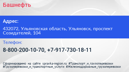 Башнефть по адресу 432072, Ульяновская область, Ульяновск, проспект Созидателей, 104 в дальнейшем Организация, размещена в следующих категориях: