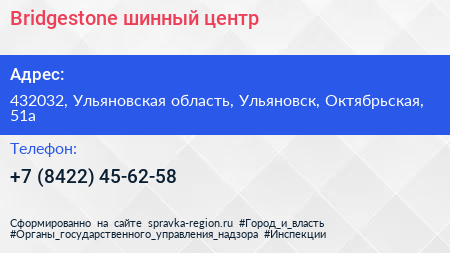Bridgestone, шинный центр по адресу 432032, Ульяновская область, Ульяновск, Октябрьская, 51а в дальнейшем Организация, размещена в следующих категориях: