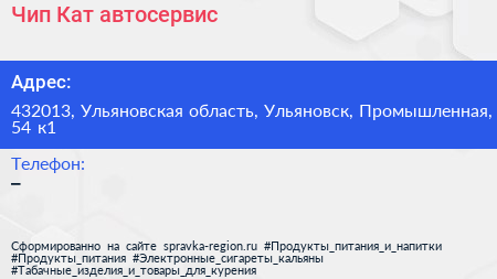 Чип & Кат, автосервис по адресу 432013, Ульяновская область, Ульяновск, Промышленная, 54 к1 в дальнейшем Организация, размещена в следующих категориях: