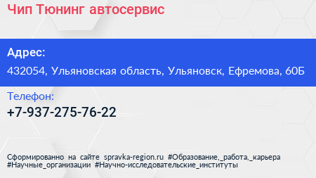 Чип-Тюнинг, автосервис по адресу 432054, Ульяновская область, Ульяновск, Ефремова, 60Б в дальнейшем Организация, размещена в следующих категориях: