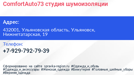 ComfortAuto73, студия шумоизоляции по адресу 432001, Ульяновская область, Ульяновск, Нижнетатарская, 19 в дальнейшем Организация, размещена в следующих категориях: