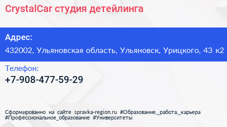 CrystalCar, студия детейлинга по адресу 432002, Ульяновская область, Ульяновск, Урицкого, 43 к2 в дальнейшем Организация, размещена в следующих категориях: