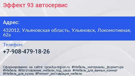 Эффект-93, автосервис по адресу 432012, Ульяновская область, Ульяновск, Локомотивная, 62а в дальнейшем Организация, размещена в следующих категориях: