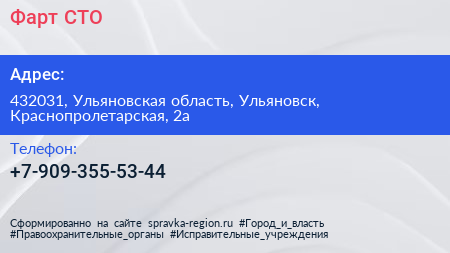 Фарт, СТО по адресу 432031, Ульяновская область, Ульяновск, Краснопролетарская, 2а в дальнейшем Организация, размещена в следующих категориях: