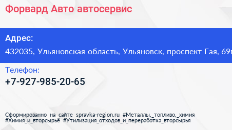 Форвард Авто, автосервис по адресу 432035, Ульяновская область, Ульяновск, проспект Гая, 69г в дальнейшем Организация, размещена в следующих категориях: