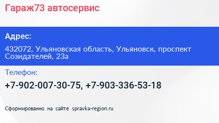 Гараж73, автосервис по адресу 432072, Ульяновская область, Ульяновск, проспект Созидателей, 23а в дальнейшем Организация, размещена в следующих категориях: