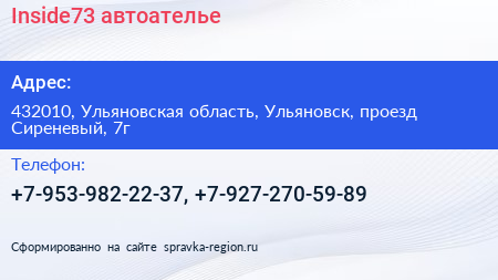 Inside73, автоателье по адресу 432010, Ульяновская область, Ульяновск, проезд Сиреневый, 7г в дальнейшем Организация, размещена в следующих категориях: