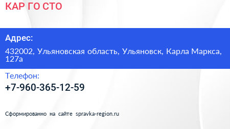 КАР-ГО, СТО по адресу 432002, Ульяновская область, Ульяновск, Карла Маркса, 127а в дальнейшем Организация, размещена в следующих категориях: