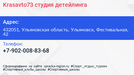 Krasavto73, студия детейлинга по адресу 432051, Ульяновская область, Ульяновск, Фестивальная, 42 в дальнейшем Организация, размещена в следующих категориях:
