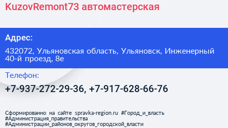 KuzovRemont73, автомастерская по адресу 432072, Ульяновская область, Ульяновск, Инженерный 40-й проезд, 8е в дальнейшем Организация, размещена в следующих категориях: