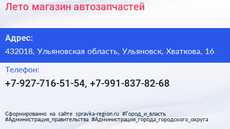 Лето, магазин автозапчастей по адресу 432018, Ульяновская область, Ульяновск, Хваткова, 16 в дальнейшем Организация, размещена в следующих категориях: