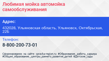 Любимая мойка, автомойка самообслуживания по адресу 432028, Ульяновская область, Ульяновск, Октябрьская, 22Б в дальнейшем Организация, размещена в следующих категориях: