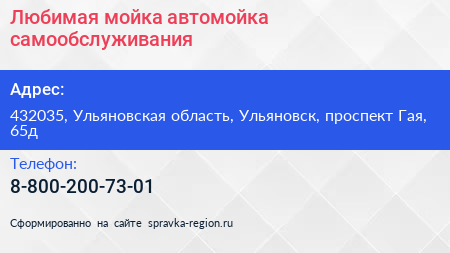 Любимая мойка, автомойка самообслуживания по адресу 432035, Ульяновская область, Ульяновск, проспект Гая, 65д в дальнейшем Организация, размещена в следующих категориях: