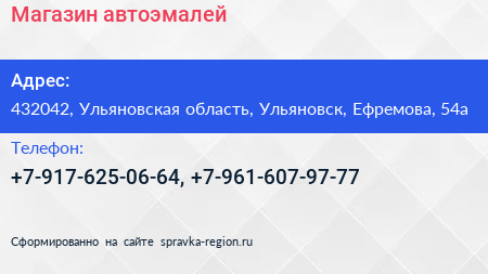 Магазин автоэмалей по адресу 432042, Ульяновская область, Ульяновск, Ефремова, 54а в дальнейшем Организация, размещена в следующих категориях:
