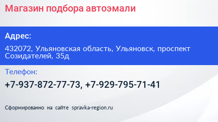 Магазин подбора автоэмали по адресу 432072, Ульяновская область, Ульяновск, проспект Созидателей, 35д в дальнейшем Организация, размещена в следующих категориях: