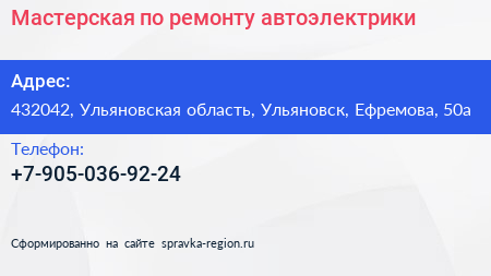 Мастерская по ремонту автоэлектрики по адресу 432042, Ульяновская область, Ульяновск, Ефремова, 50а в дальнейшем Организация, размещена в следующих категориях: