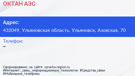 ОКТАН, АЗС по адресу 432049, Ульяновская область, Ульяновск, Азовская, 70 в дальнейшем Организация, размещена в следующих категориях: