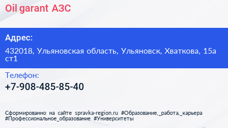 Oil garant, АЗС по адресу 432018, Ульяновская область, Ульяновск, Хваткова, 15а ст1 в дальнейшем Организация, размещена в следующих категориях: