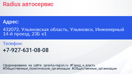 Radius, автосервис по адресу 432072, Ульяновская область, Ульяновск, Инженерный 14-й проезд, 23Б к1 в дальнейшем Организация, размещена в следующих категориях: