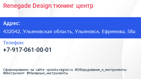 Renegade Design, тюнинг-центр по адресу 432042, Ульяновская область, Ульяновск, Ефремова, 58а в дальнейшем Организация, размещена в следующих категориях: