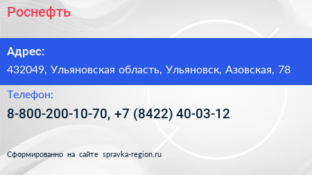 Роснефть по адресу 432049, Ульяновская область, Ульяновск, Азовская, 78 в дальнейшем Организация, размещена в следующих категориях: