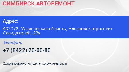 СИМБИРСК-АВТОРЕМОНТ по адресу 432072, Ульяновская область, Ульяновск, проспект Созидателей, 23а в дальнейшем Организация, размещена в следующих категориях: