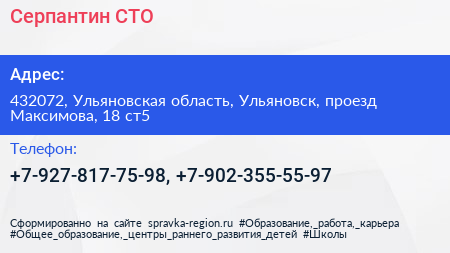 Серпантин, СТО по адресу 432072, Ульяновская область, Ульяновск, проезд Максимова, 18 ст5 в дальнейшем Организация, размещена в следующих категориях: