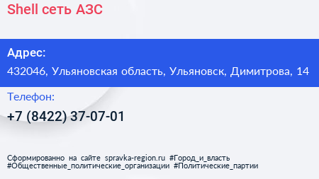 Shell, сеть АЗС по адресу 432046, Ульяновская область, Ульяновск, Димитрова, 14 в дальнейшем Организация, размещена в следующих категориях: