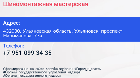 Шиномонтажная мастерская по адресу 432030, Ульяновская область, Ульяновск, проспект Нариманова, 77а в дальнейшем Организация, размещена в следующих категориях: