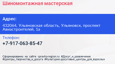 Шиномонтажная мастерская по адресу 432064, Ульяновская область, Ульяновск, проспект Авиастроителей, 1а в дальнейшем Организация, размещена в следующих категориях: