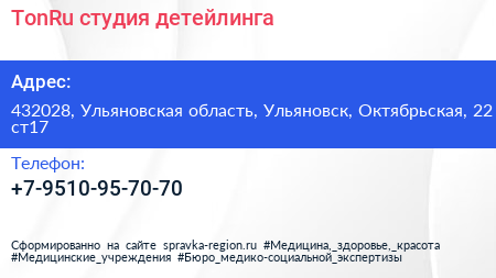 TonRu, студия детейлинга по адресу 432028, Ульяновская область, Ульяновск, Октябрьская, 22 ст17 в дальнейшем Организация, размещена в следующих категориях: