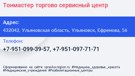 Тонмастер, торгово-сервисный центр по адресу 432042, Ульяновская область, Ульяновск, Ефремова, 56 в дальнейшем Организация, размещена в следующих категориях: