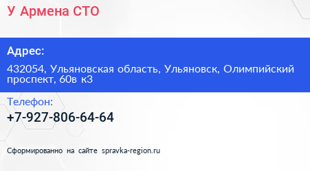 У Армена, СТО по адресу 432054, Ульяновская область, Ульяновск, Олимпийский проспект, 60в к3 в дальнейшем Организация, размещена в следующих категориях: