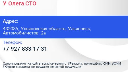 У Олега, СТО по адресу 432035, Ульяновская область, Ульяновск, Автомобилистов, 2а в дальнейшем Организация, размещена в следующих категориях: